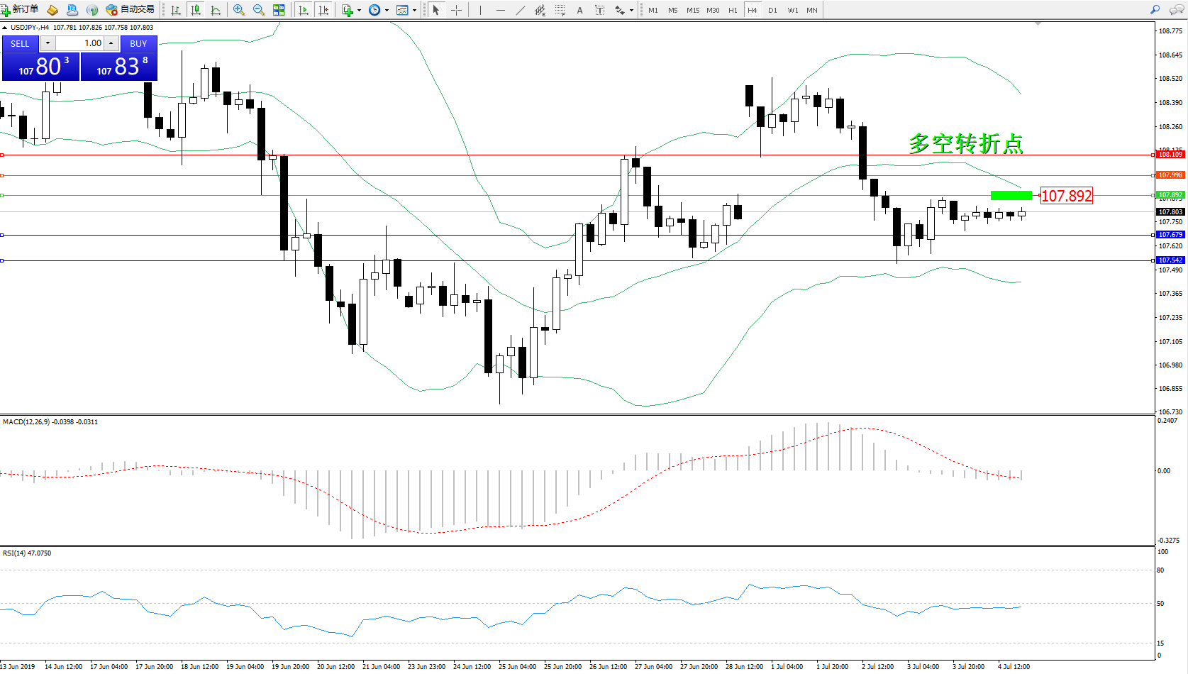 交易策略:107.892下方看跌,目标107.679、107.542