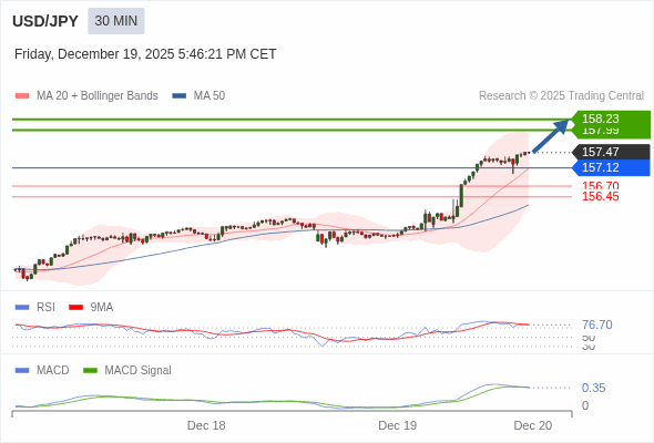 交易策略: 看涨,当 157.12 为支撑位,目标定在158.23。