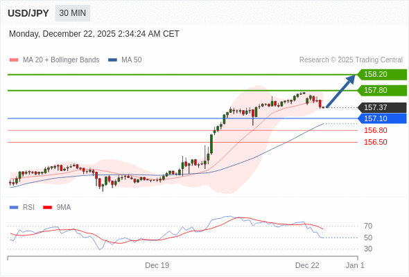 在 157.10 之上,看涨,目标价位为 157.80 ,然后为 158.20 。