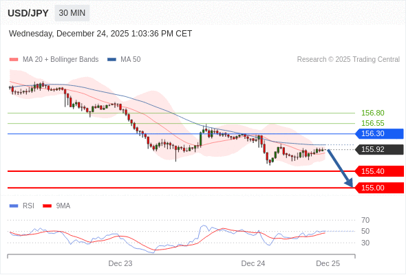 在 156.30 之下,看跌,目标价位为 155.40 ,然后为 155.00 。