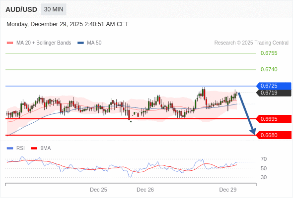 在 0.6725 之下,看跌,目标价位为 0.6695 ,然后为 0.6680 。
