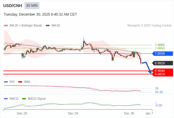 技术点评: RSI技术指标小于中性区域50。 MACD技术指标处在其信号线之下看空。 配置为负。 此外,价位低于其20天及50天移动平均线 ( 分别位于6.9986 和7.0010 )。 最后,价位跌破其布林线通道下轨 (位于6.9940。