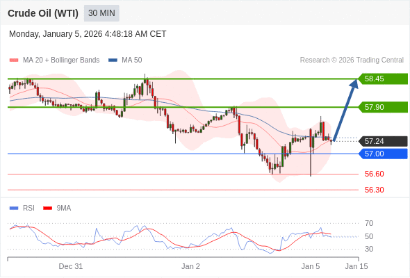在 57.00 之上,看涨,目标价位为 57.90 ,然后为 58.45 。