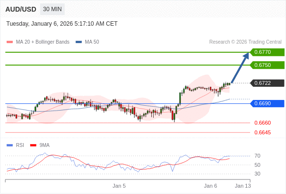 在 0.6690 之上,看涨,目标价位为 0.6750 ,然后为 0.6770 。