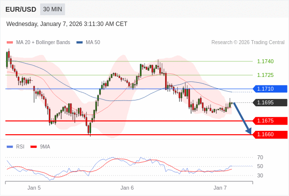 欧元/美元 当日内: 短期关键阻力位在1.1710。