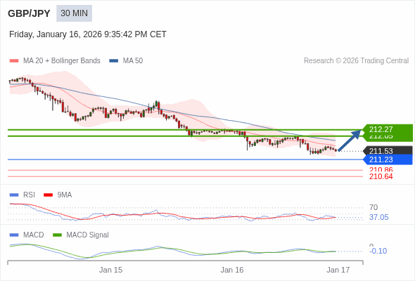 英镑/日元 当日内 : 有上涨的可能,目标价位定在 212.27 。