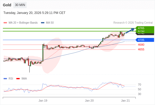 交易策略: 在 4705 之上,看涨,目标价位为 4750 ,然后为 4765 。