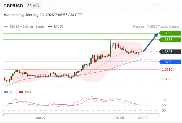 在 1.3750 之上,看涨,目标价位为 1.3865 ,然后为 1.3900 。