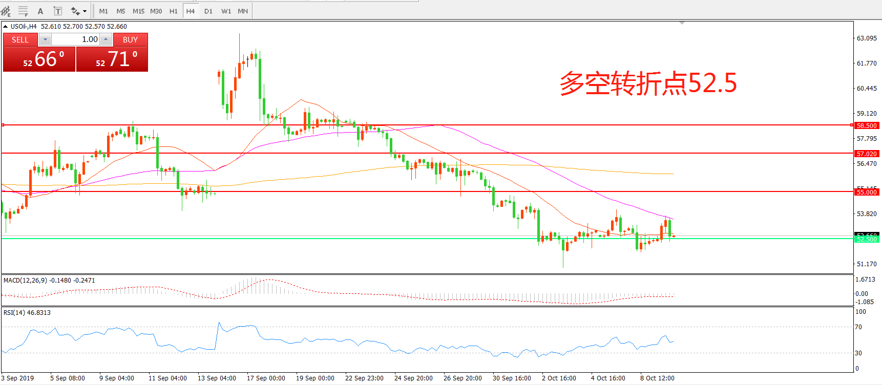 4小时图看,油价再次冲高,触碰55周期均线回落,呈现窄幅震荡形态,52.5成为短期争夺焦点,MACD绿柱缩短,RSI指标向下,日内延续震荡概率较大。