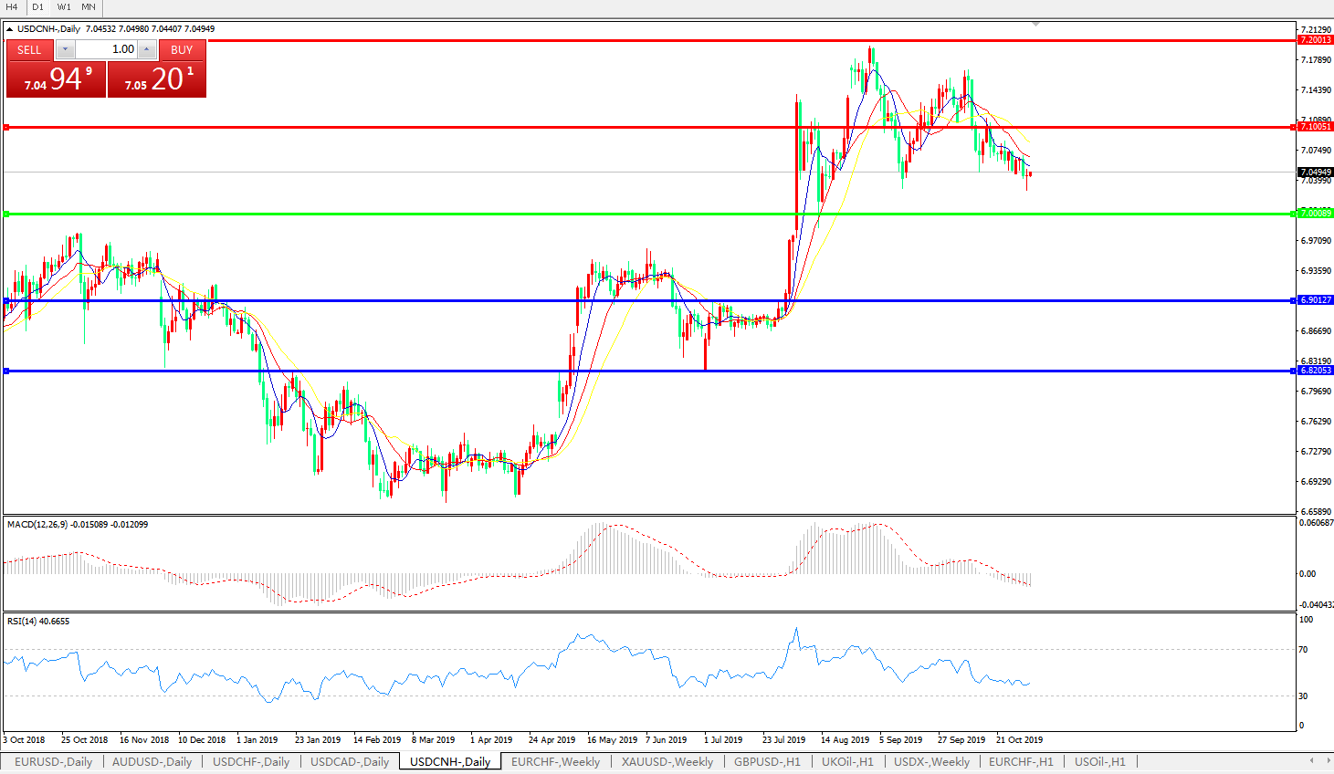 技术面简析:日图短期均线呈空头排列,汇价缓步走低,MACD下穿0轴且量能0轴下方小幅放量,RSI持续小幅走低,预计短期汇价大概率将进一步下行,汇价持续运行于7.00-7.10区间的概率较大;关注中美贸易谈判最新进展。
