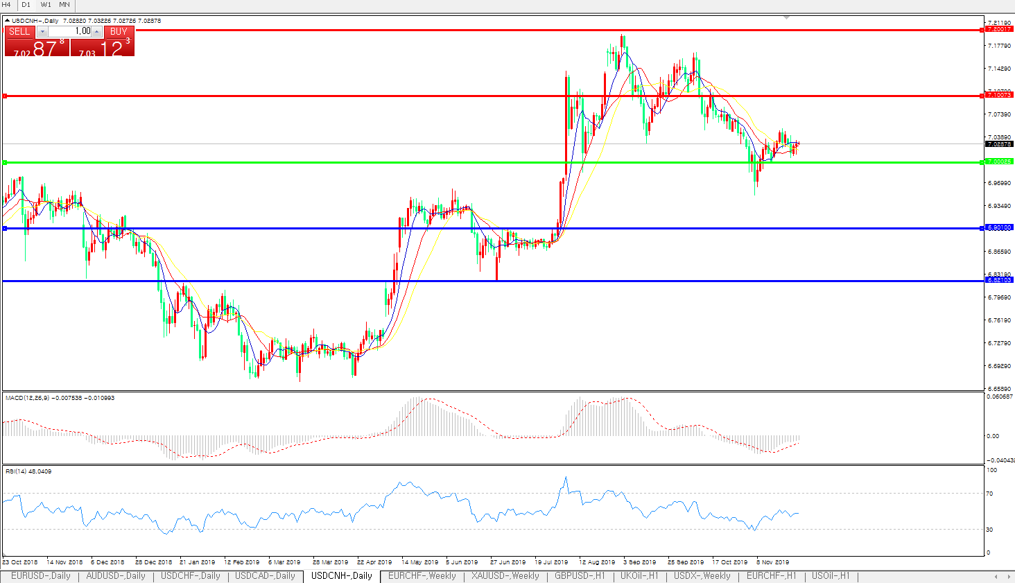 技术面简析:日图均线粘合无明显方向,汇价7.0关口上方窄幅整理,MACD运行于0轴下方但量能持续收缩,RSI整理中走低,预计短期汇价将在7.0关口附近整理,中期汇价需等待美元指数及中美贸易谈判最新进展指引。