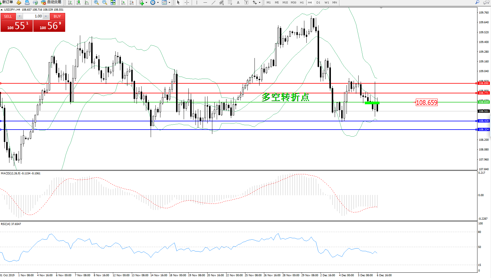 交易策略:108.659下方看跌,目标108.428108.324