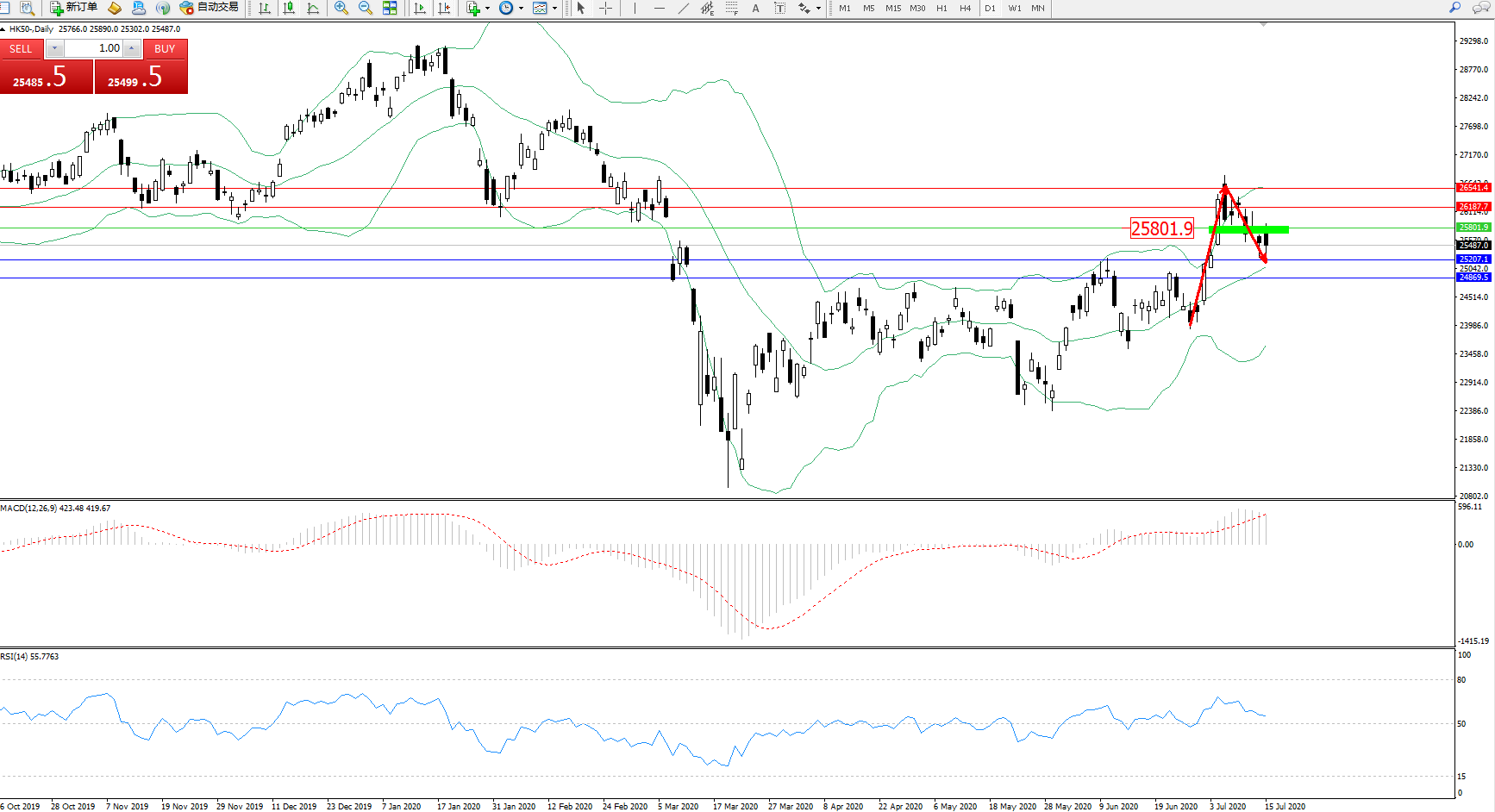 恒指HK50 ——日K线图显示: