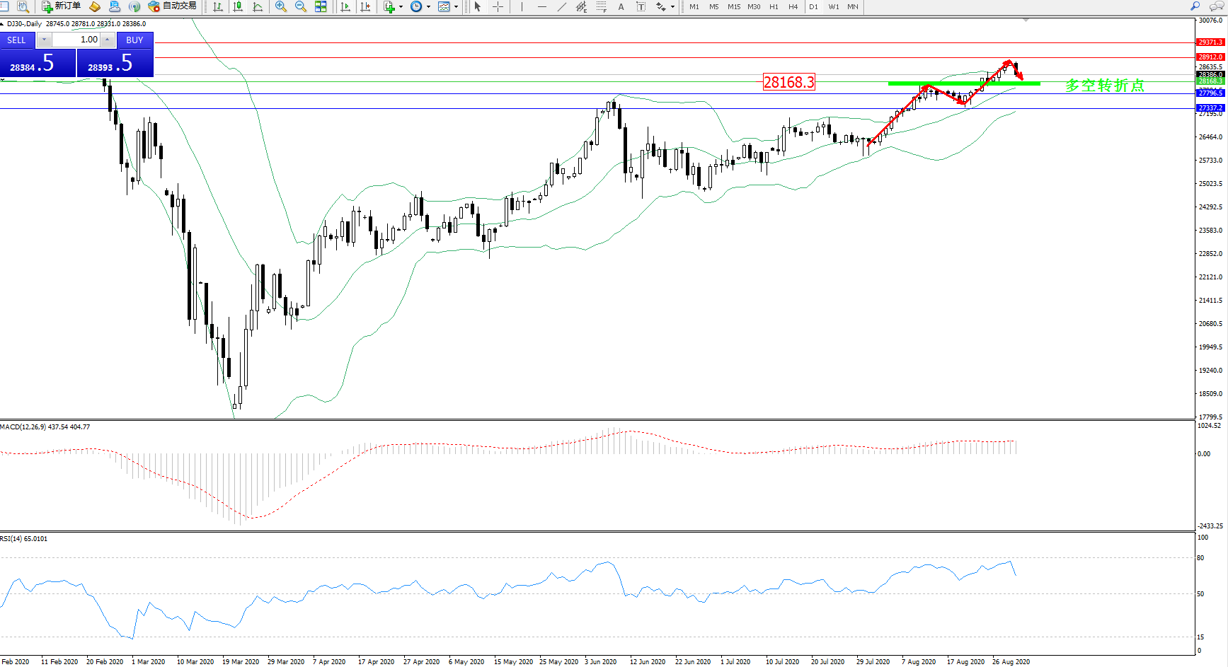 交易策略:28168上方看涨,目标28912、29371