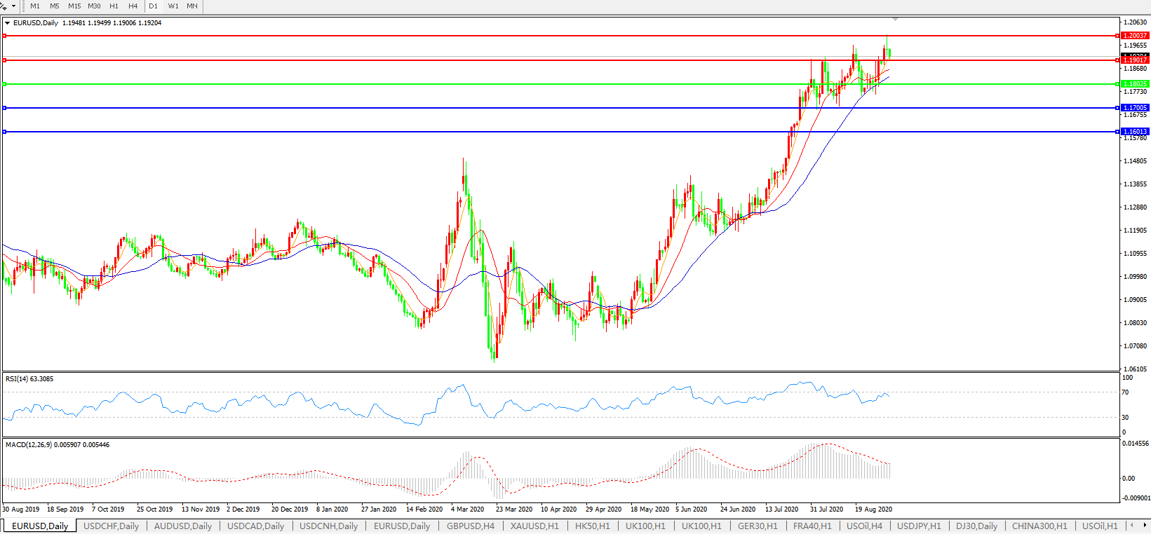 在美元全线走低的推动下,欧元兑美元昨晚一度升破1.20这一关键水平。当前投资者对欧元前景保持乐观,投机者的看涨头寸也达到创纪录水平。自3月下旬新冠疫情引发市场震荡以来, 欧元已上涨10%以上;新加坡SAV Markets的首席策略师表示,美国货币供应量的扩张和美联储的量化宽松政策以及美国的赤字都对美元构成负面影响,有利于欧元等货币,尤其是考虑到欧盟复苏基金推出的情况下。预计欧元兑美元将继续大幅反弹,可能突破略低于1.21的长线阻力位,一旦超出该水平,将上看1.25。