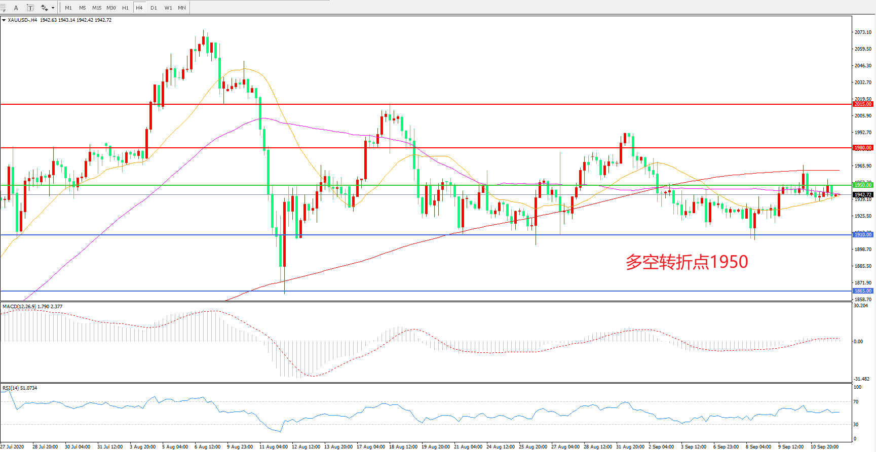 4小时图看,金价波幅逐渐收窄,短期方向并不明确,1950成为短期阻力,均线系统走平,MACD红柱增加,日内延续震荡概率较大。