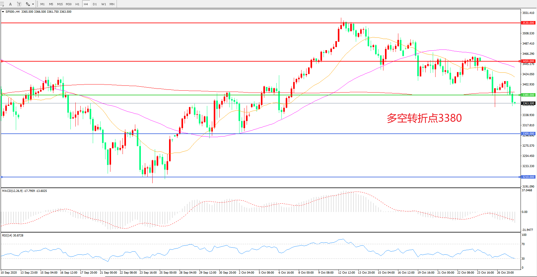 4小时图看,标普500震荡下行,整体表现十分低迷,短期均线拐头向下,MACD绿柱增加,RSI指标走平,日内延续下行概率较大。