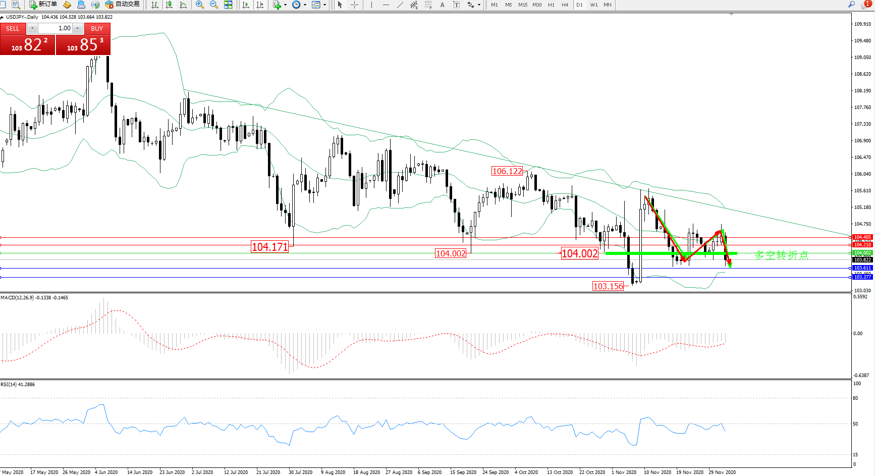 交易策略:104.002下方看跌,目标103.611、103.377