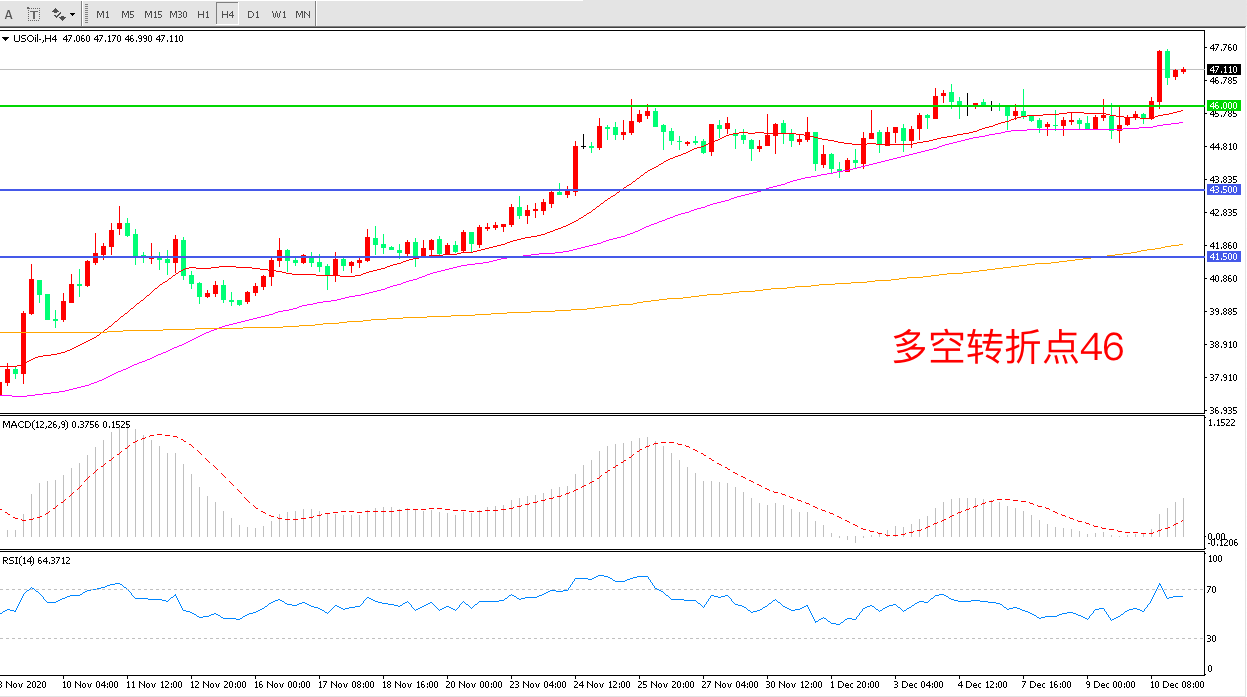 4小时图看,油价长阳拉升强势突破前期整理区间46美元成为中期多空分水岭均线系统有拐头迹象MACD红柱增加RSI指标走平,日内延续上行概率较大。