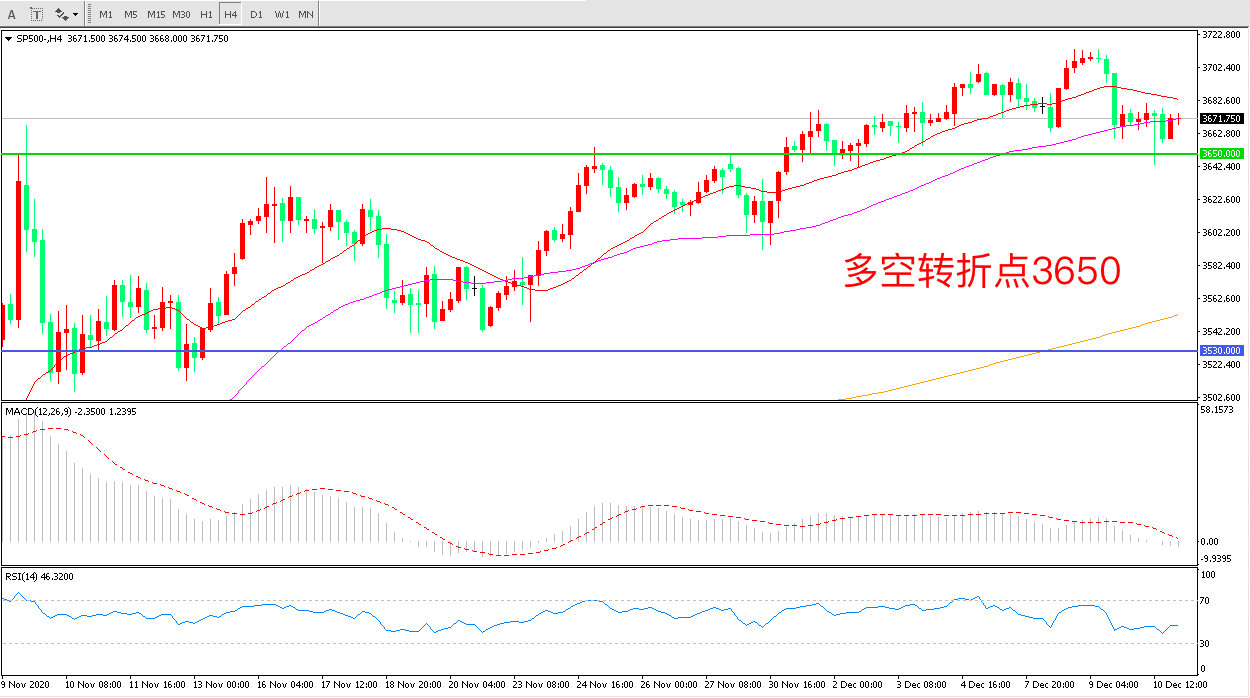 4小时图看,标普500延续高位震荡,短期涨势遭到破坏,均线系统呈多头排列,3650成为下方支撑, MACD红柱减少,RSI指标走平,日内延续震荡概率较大。