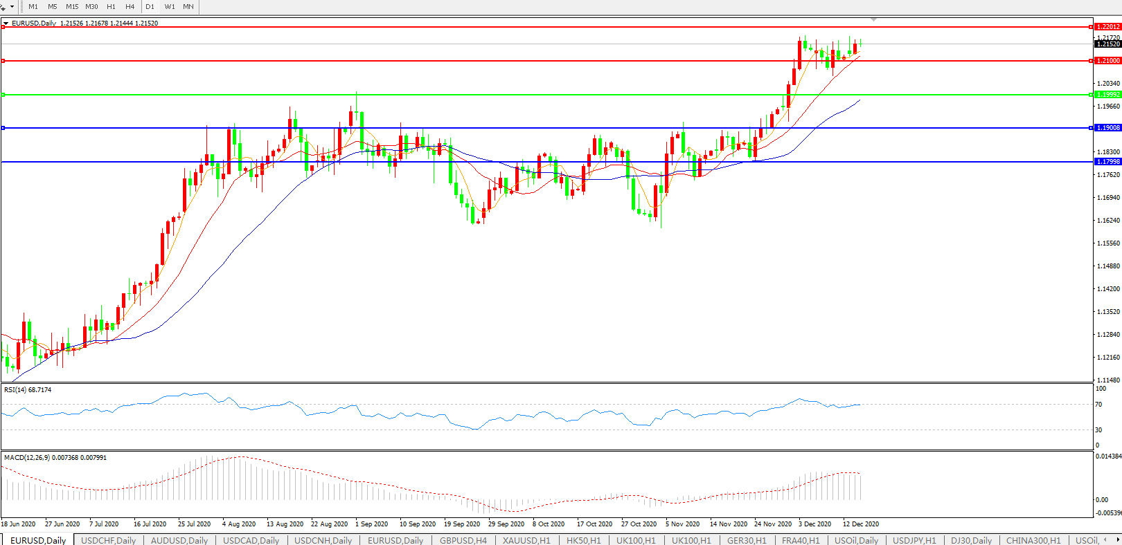 技术面简析:日图均线整体呈多头排列,汇价高位延续强势,MACD运行于0轴上方但量能0轴上小幅缩量 ,RSI高位逐步走缓,预计短期汇价大概率将在整理后进一步上行。
