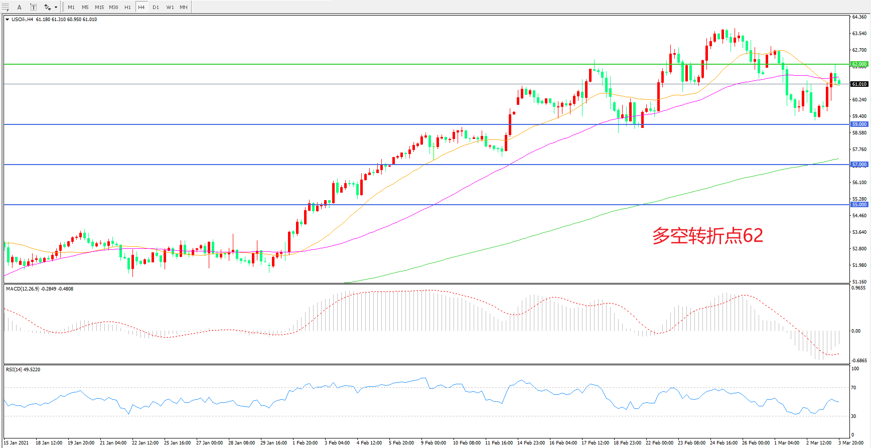 交易策略:在62.00之下看跌,目标59.00    57.00