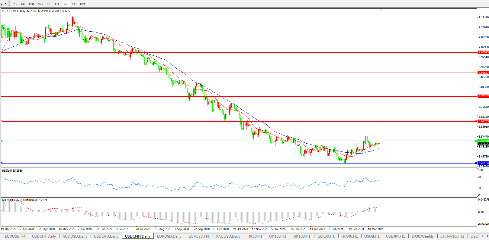 备选策略: 在6.5200之上,看涨,目标价位为6.6300,然后为6.7615。
