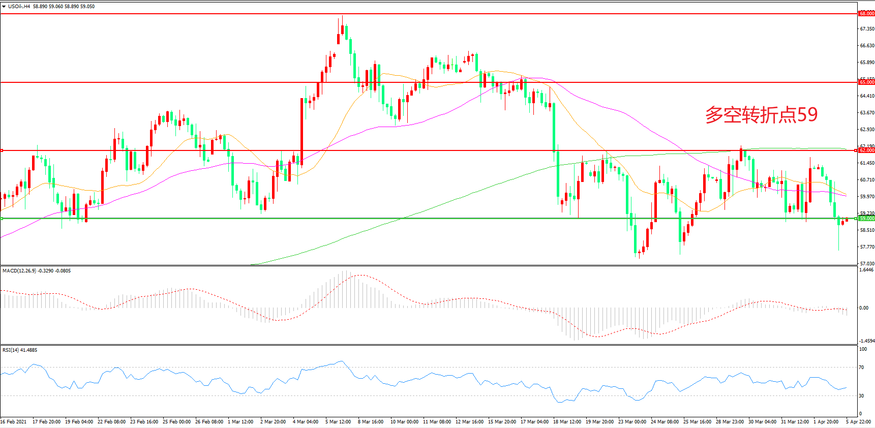 4小时图看,油价长阴下破,跌破前期整理区间,整体表现低迷,均线系统走平,形成上方阻力,59美元成为短期多空分水岭, MACD绿柱增加,RSI指标走平,日内震荡下行概率较大。