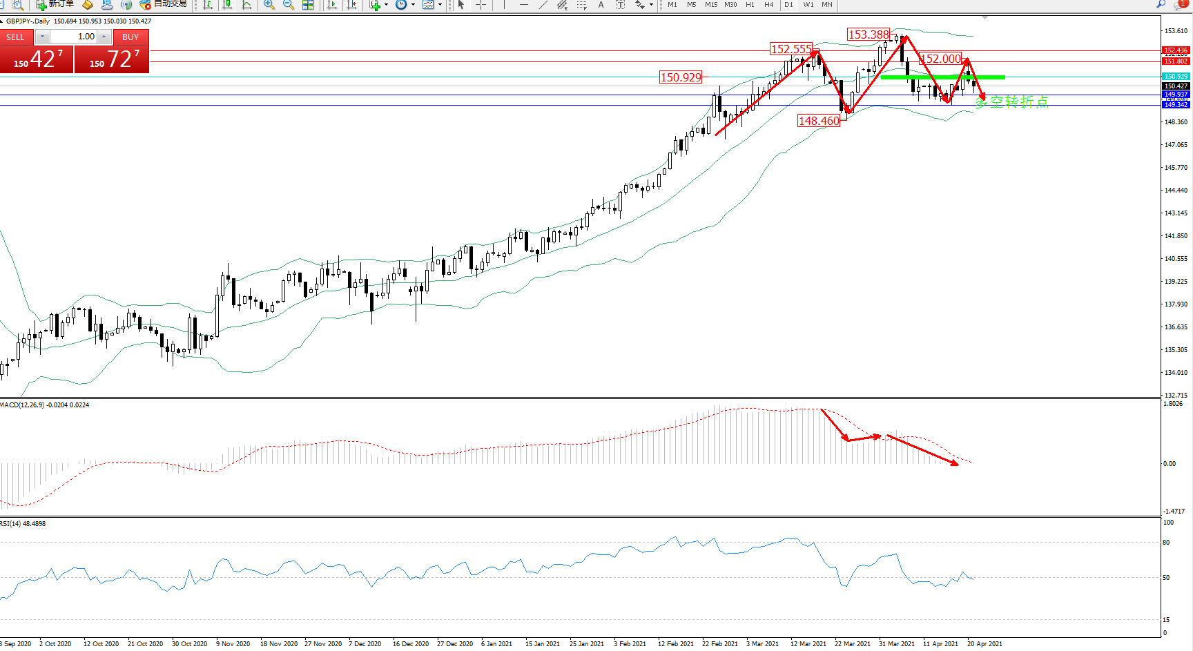 备选策略:150.929上方看涨,目标151.802、152.436