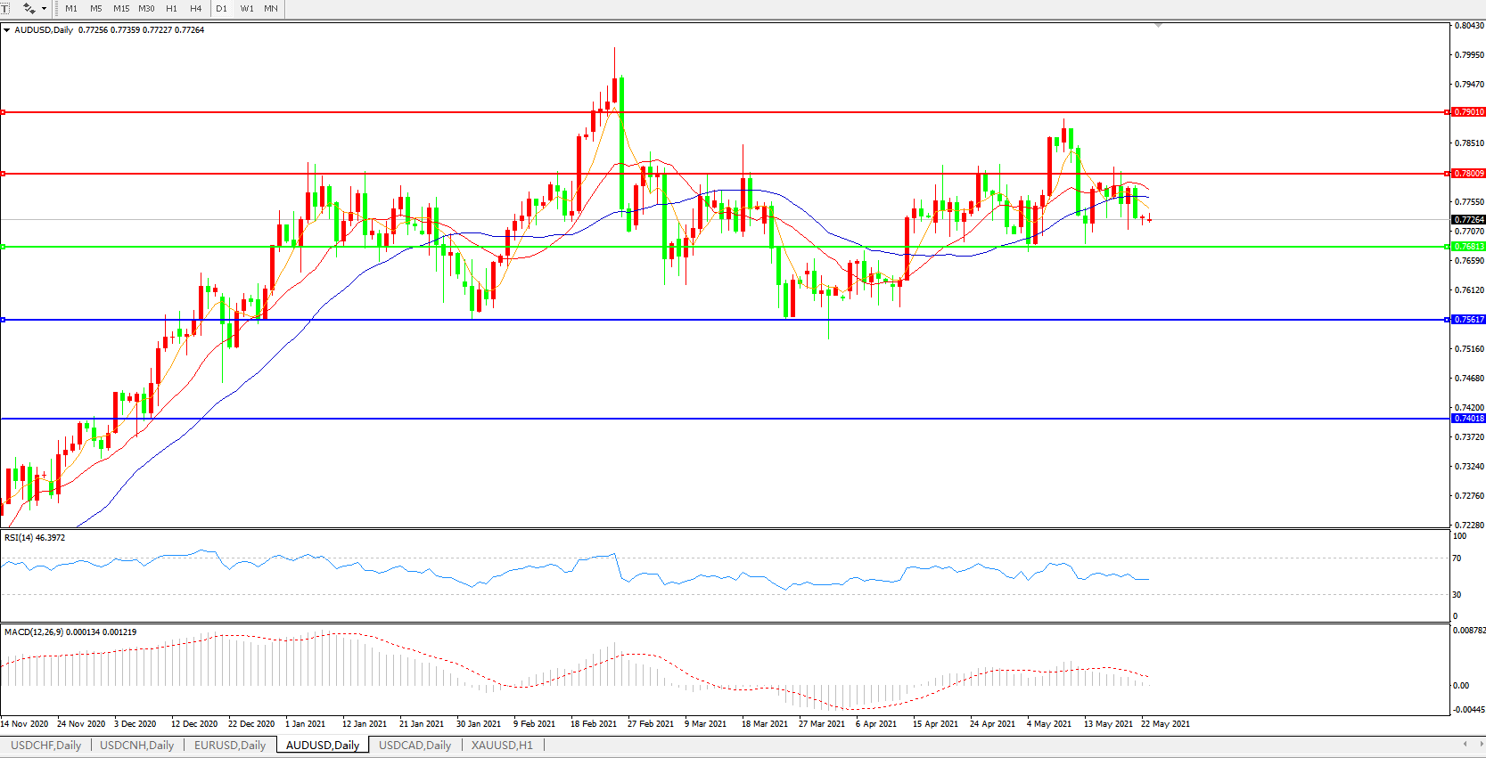 备选策略:0.7680下方看跌,目标0.7560、0.7400