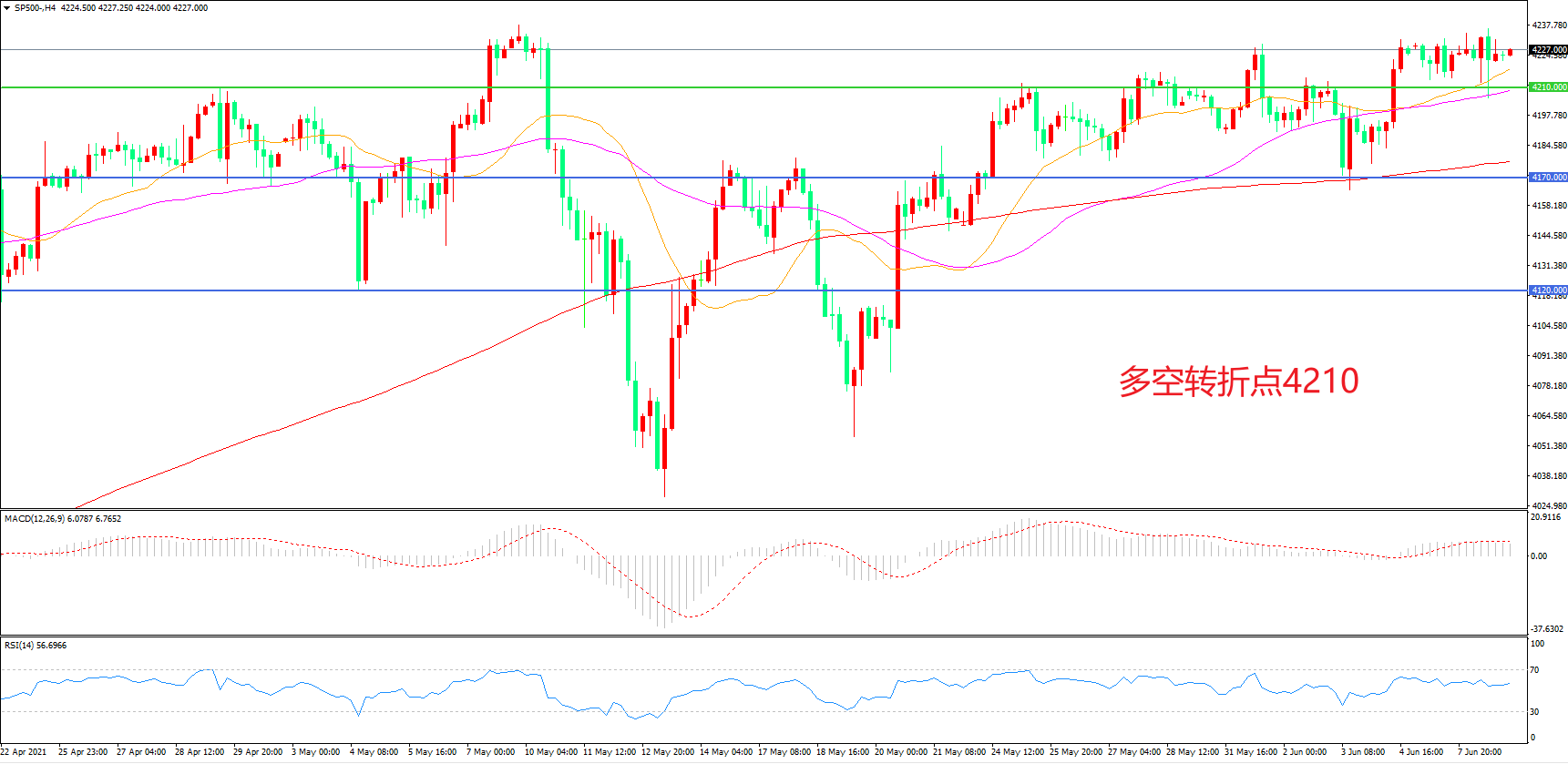 4小时图看,标普500延续高位震荡,整体表现较强,4210成为短期多空分水岭,均线系统成为下方支撑,MACD红柱增加,RSI指标走平,日内震荡上行概率较大。
