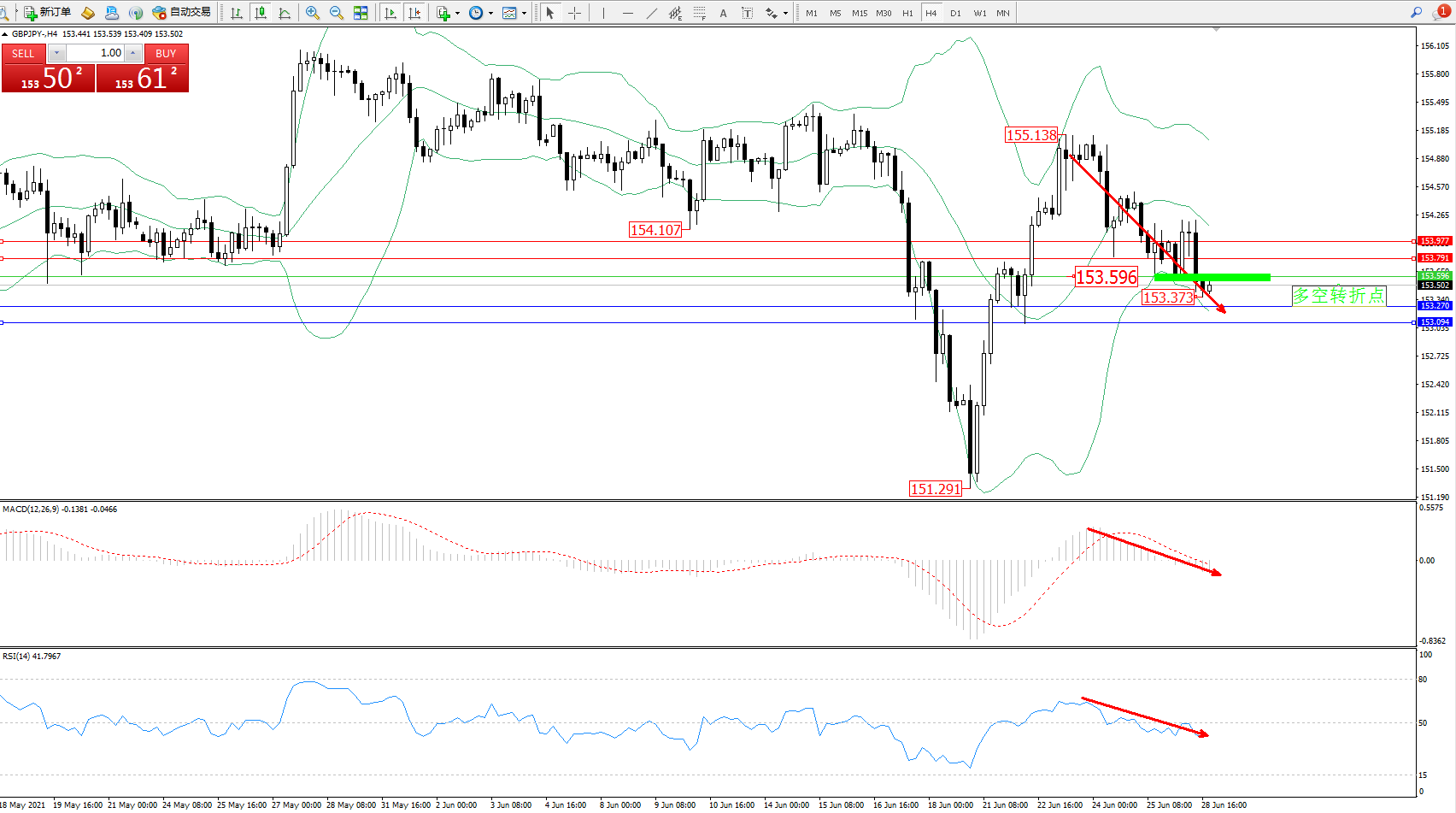 交易策略:153.596下方看跌,目标153.270、153.094