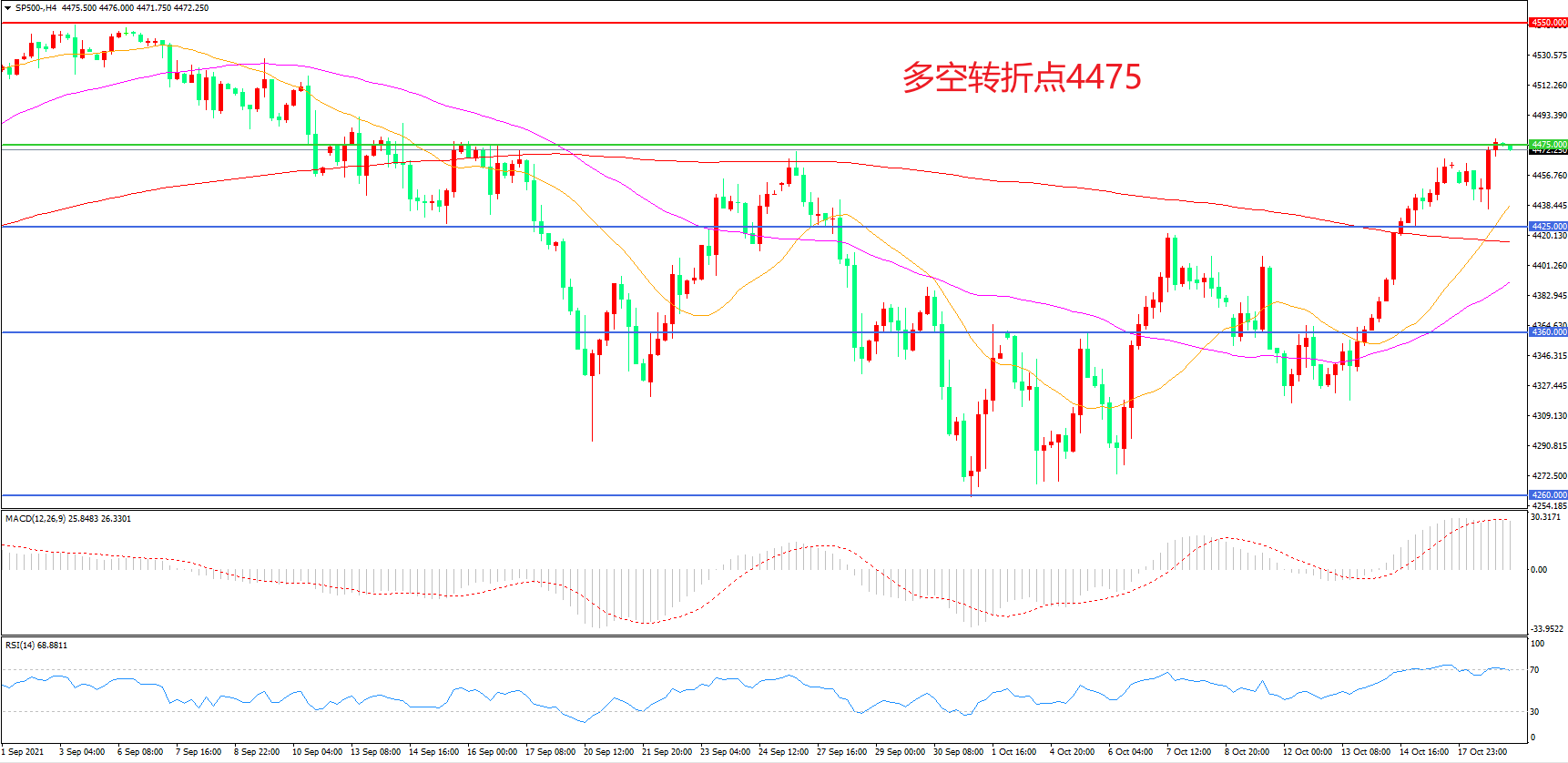 周一(10月18日),科技股再次展现强势本色,包括发布MacBook Pro等新品的苹果和将将公布三季报的特斯拉以及奈飞在内,蓝筹科技股齐涨带动标普500上行,收报4474.25点。从目前公布几家银行股财报来看,美国的后疫情时代经济复苏似乎进展仍然比较顺利,火热的市场情绪可能推动美股再创新高。
