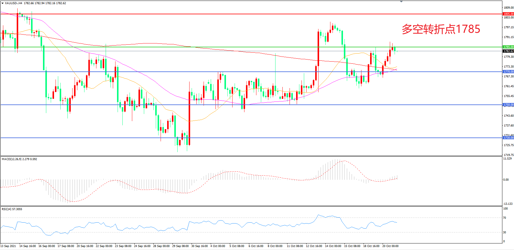 4小时图看,金价整体延续区间震荡形态,1785成为多空分水岭,均线系统粘合成为下方支撑,MACD红柱增加,RSI指标走平,日内延续震荡概率较大。