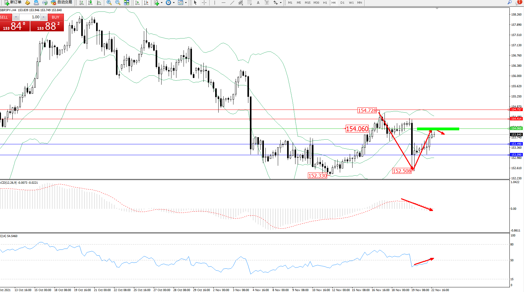 备选策略:154.060上方看涨,目标154.414、154.757