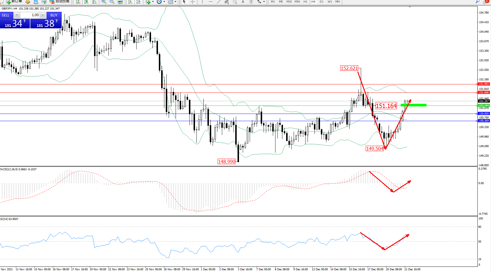 技术点评:空头动力持续震荡至149.504位置,呈V型反转上扬,纠结于布林带指标通道中上轨区间持续震荡上扬,即将触及布林带指标上轨附近节点,布林带指标呈收口走势中,MACD指标低位V型上扬至0轴线上方徘徊,RSI指标处于50均衡线上方持续震荡上扬;
