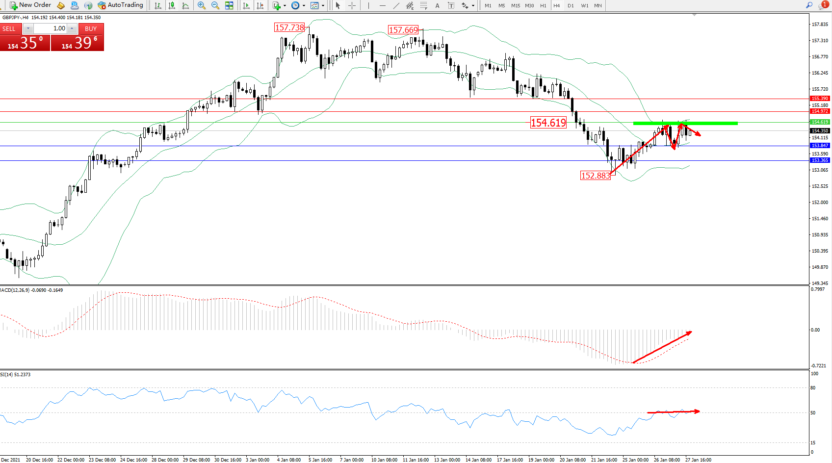 交易策略:154.619下方看跌,目标153.847、153.365