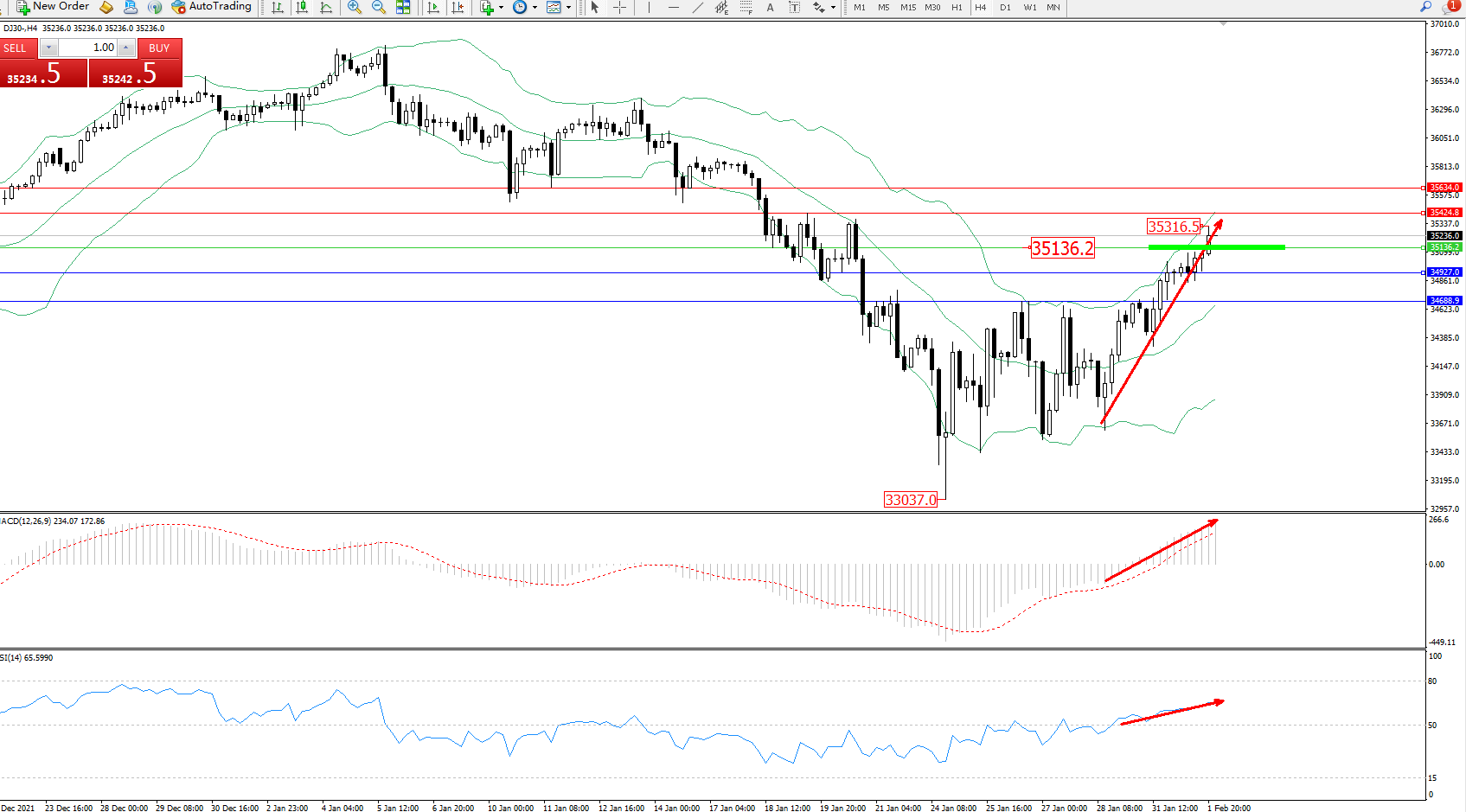 道琼斯指数DJ30——4小时K线图显示: