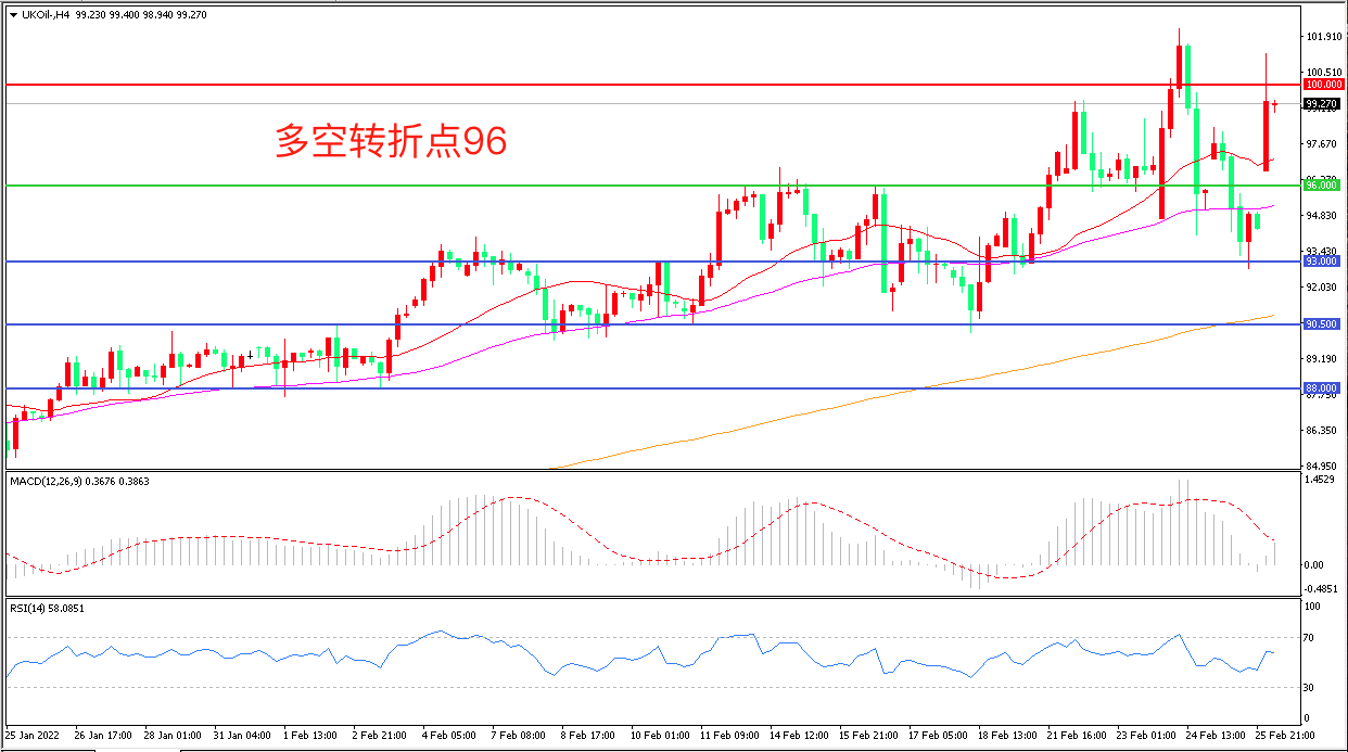 4小时图看,油价跳空高开后延续强势表现,短期走势偏强, 96美元成为多空分水岭,均线系统走平,MACD红柱缩短,RSI指标走平,日内震荡上行概率较大。