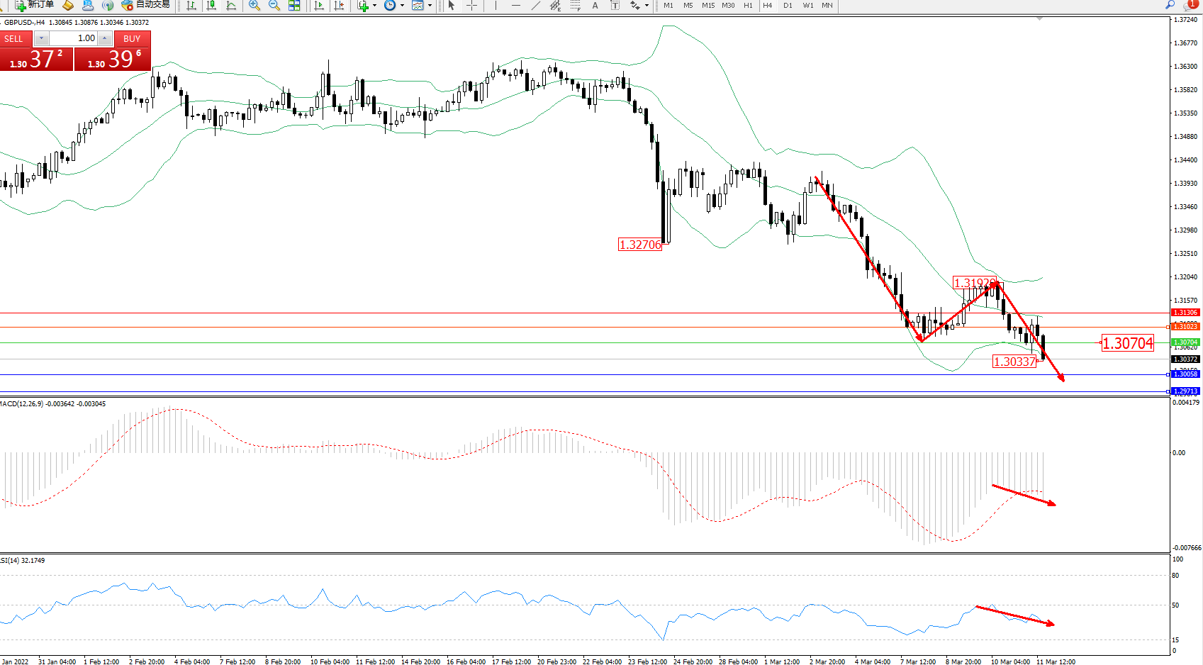 技术点评:空头动力延续布林带指标通道中下轨区间持续震荡下挫,低位抵达1.30337位置节点后有继续下探态势,布林带指标呈收口走势持续后开始缓慢张口中,MACD指标处于空头区域维持整理缓慢下行,RSI指标处于空头区域维持窄幅整理中;