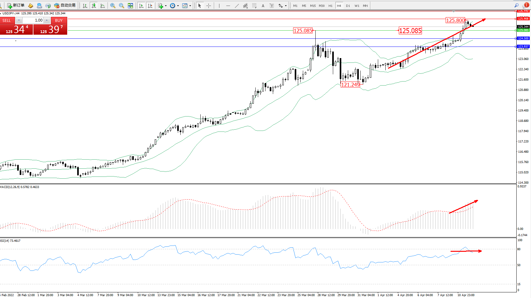技术点评:多头动力延续布林带指标通道中上轨区间持续震荡上扬,高位抵达128.800附近节点开始整理,短期多头上扬态势良好,高位拉升走势或将延续,布林带指标呈缓慢张口走势中,MACD指标处于多头区域维持震荡上扬,RSI指标处于多头区域上移至超买区80均衡线附近整理;