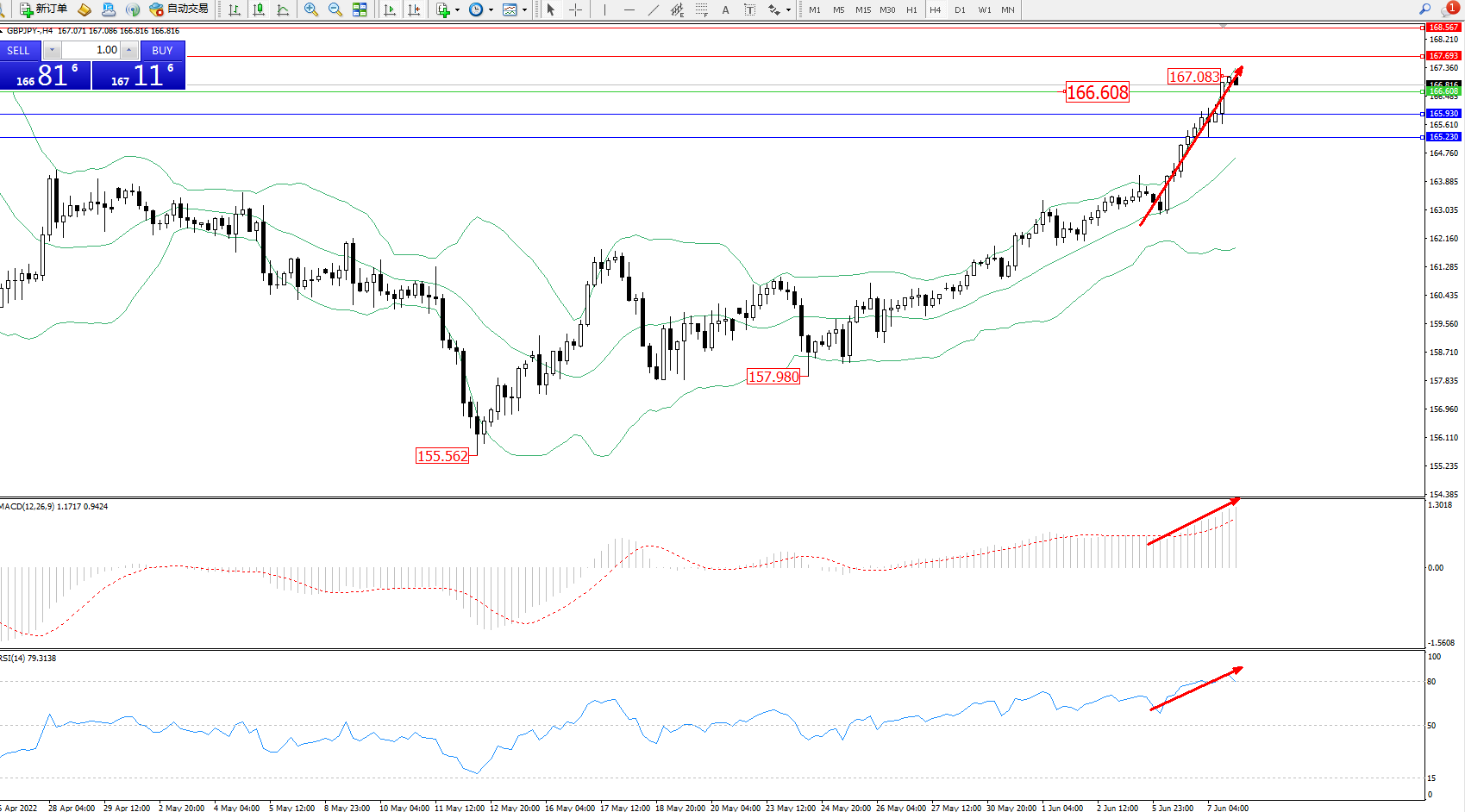 交易策略:166.608上方看涨,目标167.693、168.567
