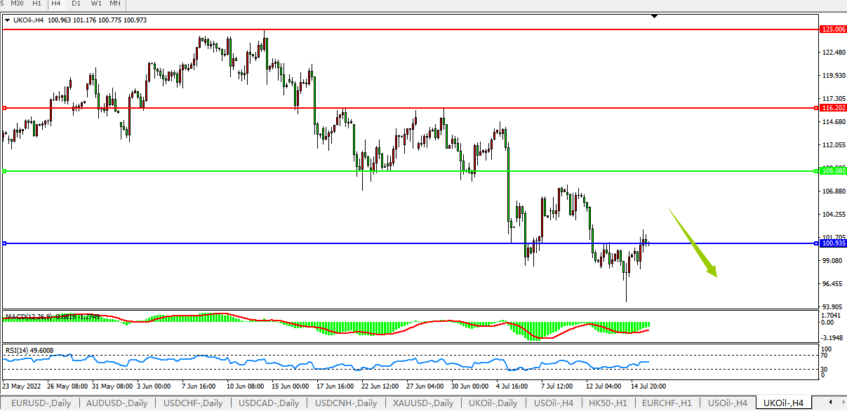 4小时图看:短线价格止跌后快速反弹,中期图形结构依旧偏弱,且趋势线破败, MACD量能柱0轴下稍微缩量,RSI小幅走升,短期油价继续反弹概率较大。