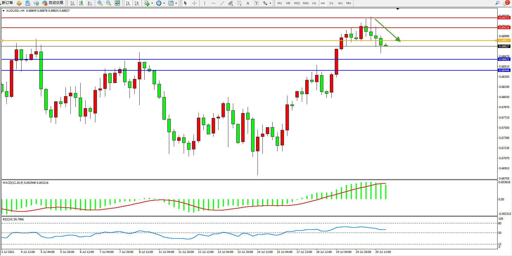 备选策略:0.68914上方看涨,目标0.69116、0.69273