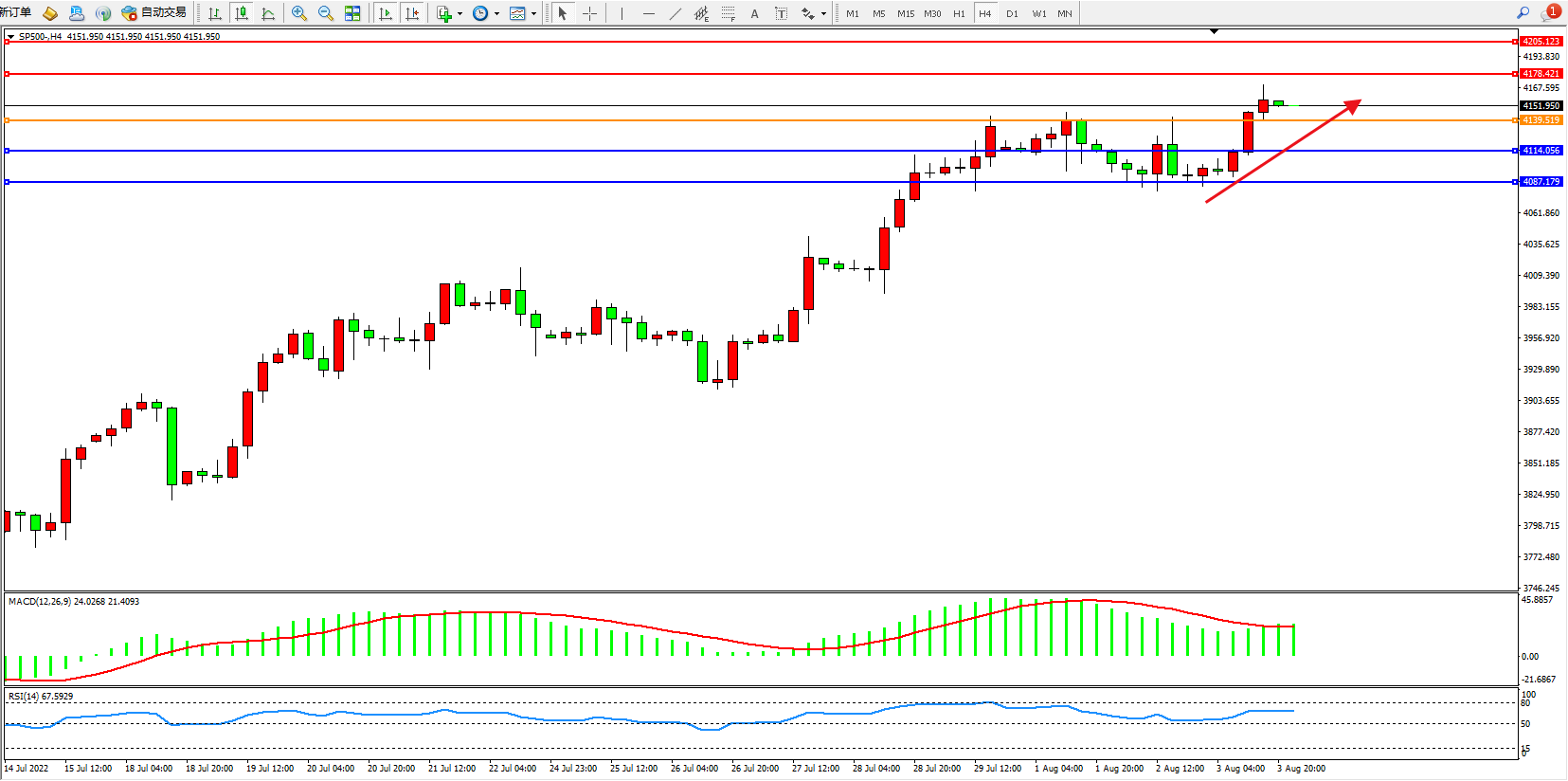 标普SP500——4小时K线图显示:
