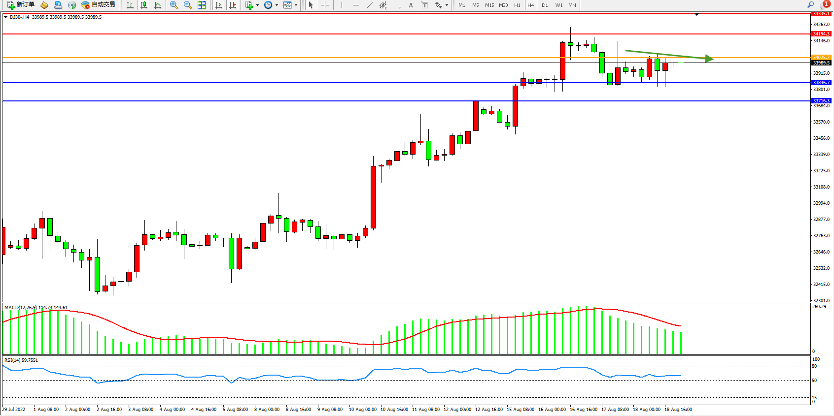 道琼斯指数DJ30——4小时K线图显示: