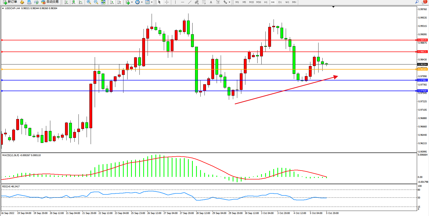 交易策略:0.98169上方看涨,目标0.98631、0.98939