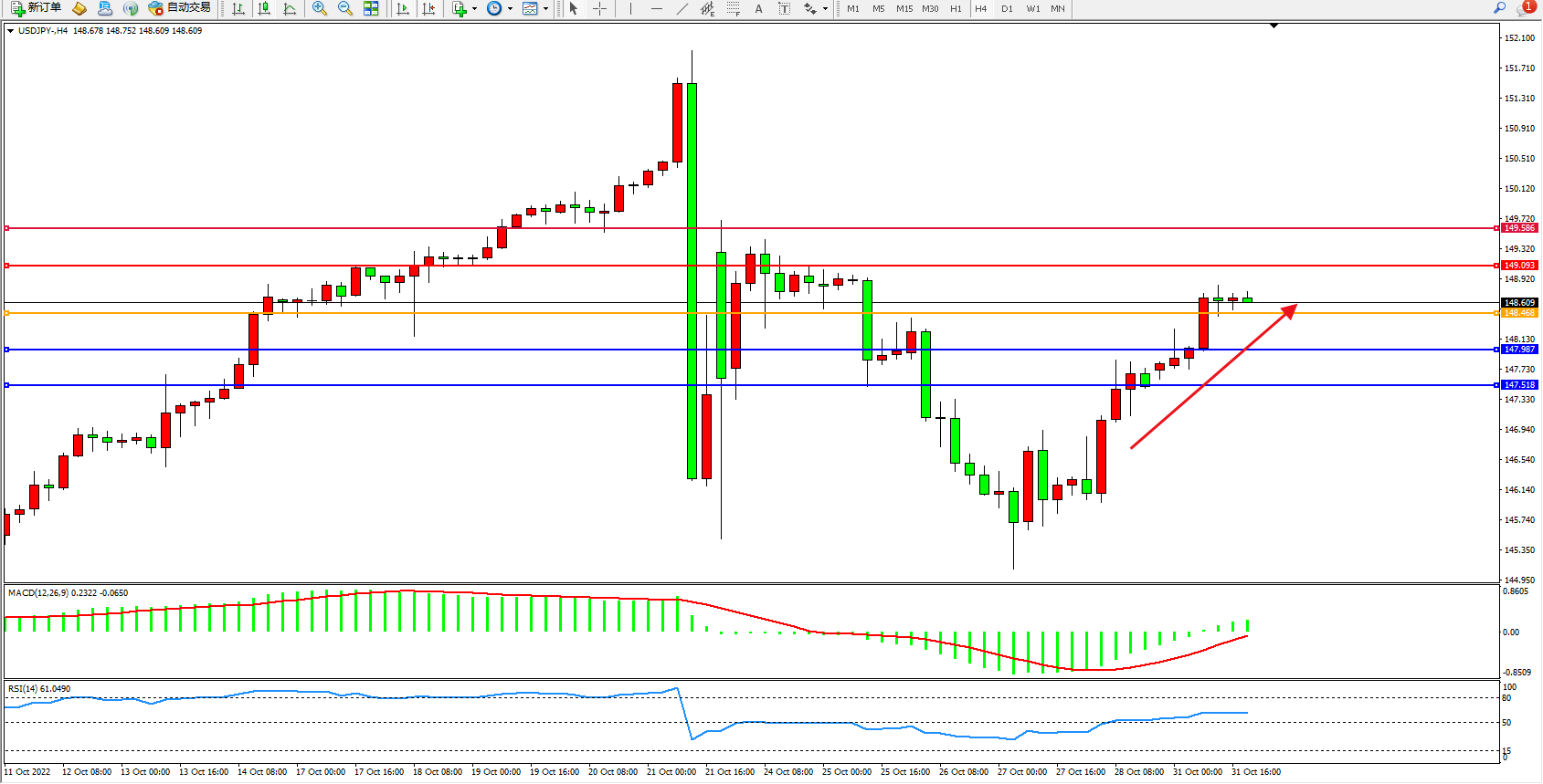 交易策略:148.468上方看涨,目标149.093、149.586