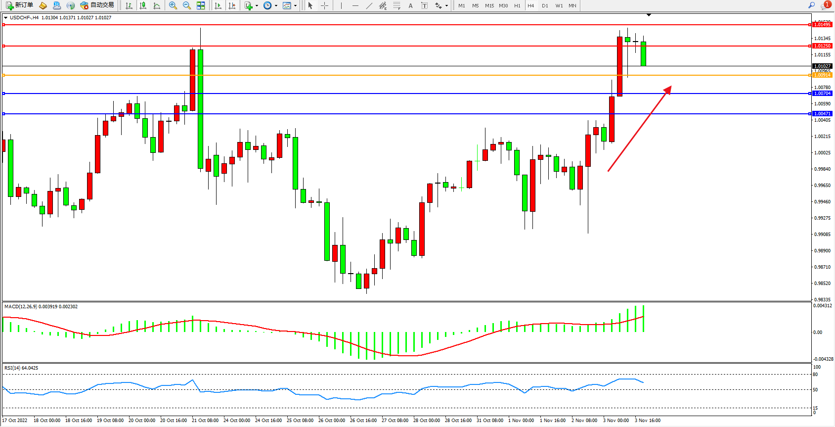 美元瑞郎USDCHF——4小时K线图显示: