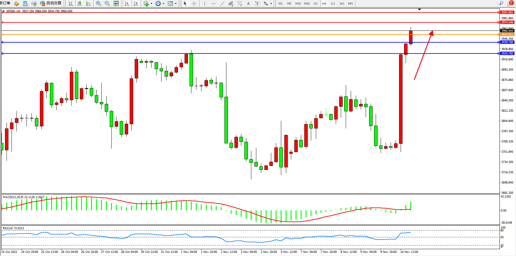 标普SP500——4小时K线图显示: